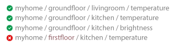 MQTT Topic是由utf-8 編碼組成,如Http的URL的概念,透過"/"進行分階層。如下圖,myhome階層下groundfloor、livingroom、temperature等,如同REST 架構中對於URI的規範類似。