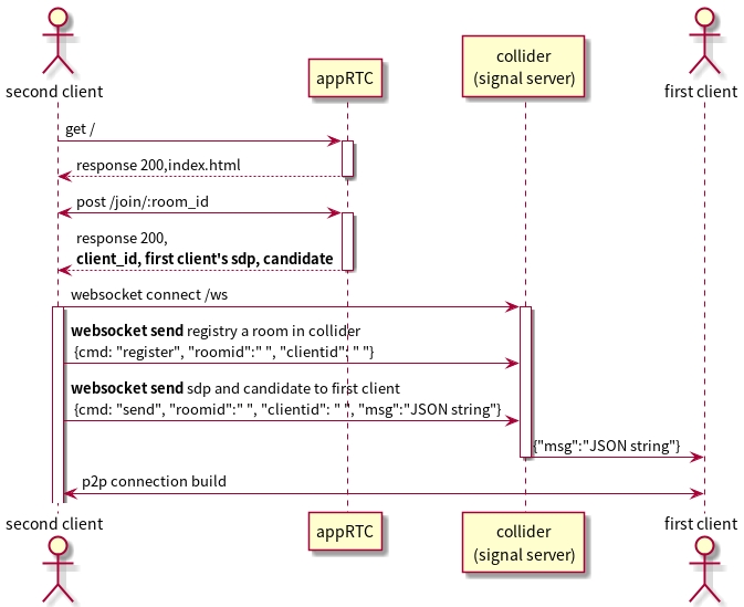 Conclusion In the AppRTC demo application, it follows Broker Architecture to coordinate p2p message exchange. Though the key-point is not the sdp and (ICE) candidate message exchanged method, but it still important to manage the exchange process. So if you read AppRTC open source, this article can help you modify this project.