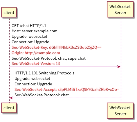 Something Important: ● Sec-WebSocket-key, Sec-Websocket-Accept: The purpose is that proves the handshake was received \1. Sec-Websocket-key is a UUID that encoded by Base64. \2. Sec-Websocket-Accept is the string that Sec-Websocket-key concatenates with decode of Sec-Websocket-key. The string will encode SHA-1 and encode Base64 before send back it.