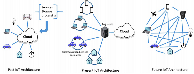 在過去物聯網裝置都是直接連上雲端裝置開始,漸漸的使用 fog架構因應同性質裝置的互連。而未來的使用場景即將是不同種類的裝置互連的使用場景。如圖1: Present IoT Architecture。
