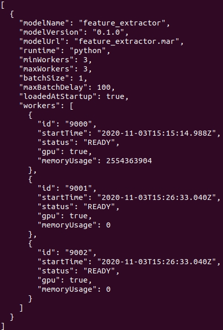 curl -v -X PUT "http://localhost:8081/models/<modelname>?min_worker=3"就已feature_extractor這個model為例:首先先看一下model的資訊