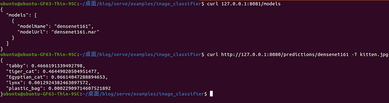 torchserve --start --model-store model-store/ --models densenet161.mar # 註冊densenet1611並啟動torchserve可以使用 curl 進行驗證是否抓到 densenet161 model,並試著傳一張圖看看是否有成功運行。