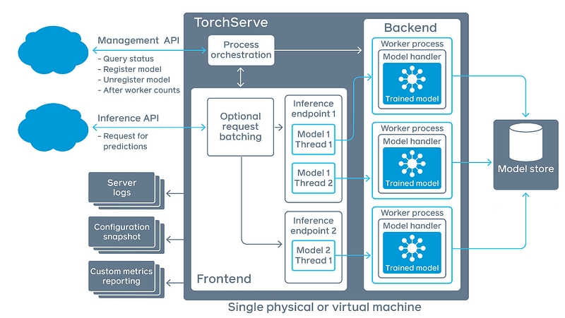Frontend:指的是 request batching + Inference API Handler。request batching 是由 Management API 設定;Inference API Handler 則是由開發者自行撰寫